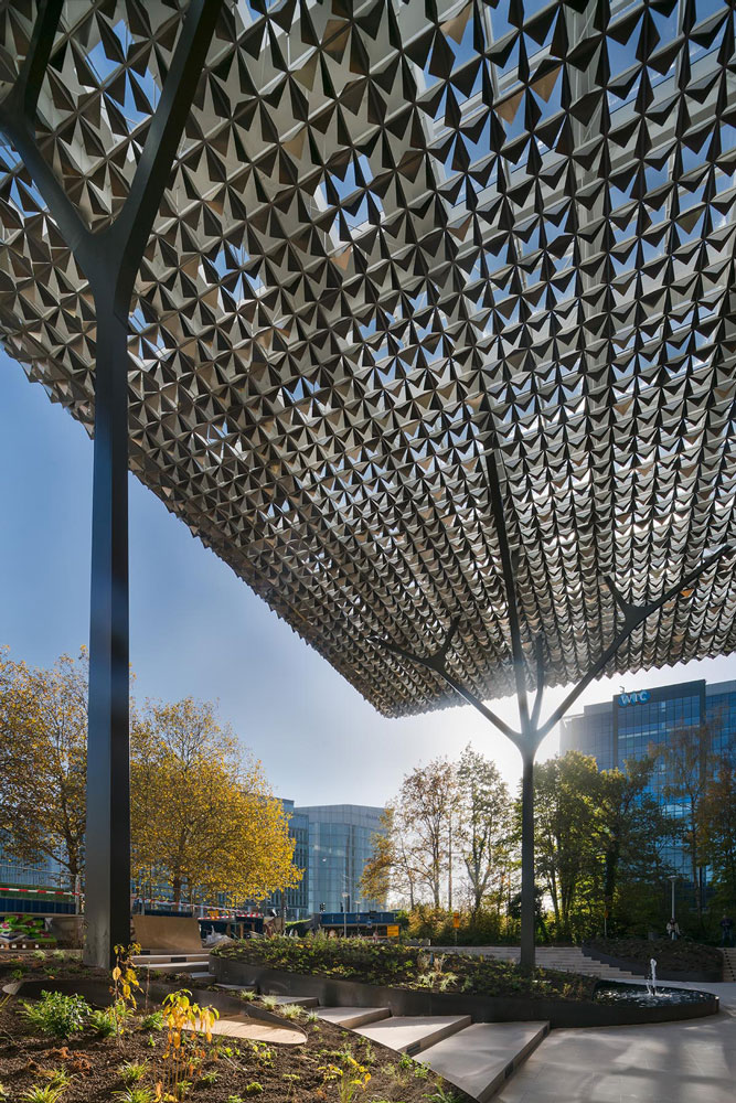 Тънки, подобни на стволове на дърво колони – три големи и три по-малки – поддържат покрива. В този покрив се издигат 6.800 листа, изработени от полиран алуминий, създавайки красив ефект върху стените и подовете, напомнящ истинска разходка в гората. Цветовете, интензивността на светлината и атмосферата се променят в зависимост от това къде и кога се разхождате през сградата.