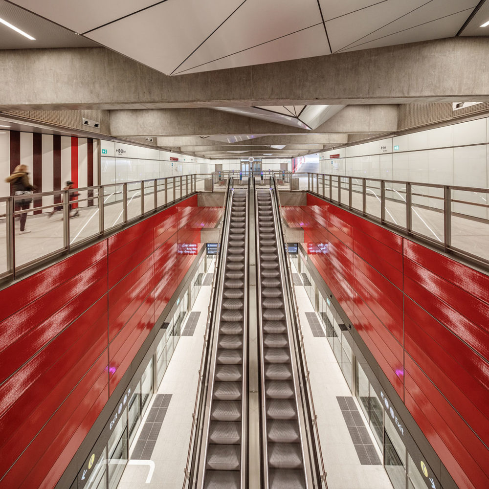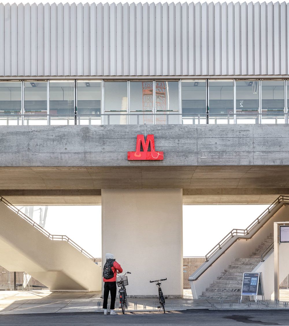 „Дизайнът на станцията Orientkaj отразява естеството и индустриалното минало на пристанищните райони, но най-важното е, че предоставя големи възможности за пътниците в този растящ район на Копенхаген“, казва Кристиан Уинтър, водещ архитект в Arup. Orientkaj, закрепена в смели бетонни скоби към пристанището на Копенхаген, представлява кутия от стъкло, бетон и алуминий с панорамна гледка към док Orientkaj. Предназначена да обслужва многофункционална градска зона от трансформирани в жилища и офиси бивши складове и нови жилищни комплекси, станцията е проектирана с достатъчно отличителна визия, която да я превърне в местната забележителност, и в същото време да се впише в средата от бели околни сгради. Предвиждайки възможното бъдещо високо строителство в близост до станцията, архитектите са използвали анодизирани алуминиеви панели на всички фасади, както и на покрива и тавана. Поставена под ъгъл, алуминиевата облицовка улавя цветовете на небето и осигурява на станцията отлични гледки от всички страни. „Гледките от платформата на станцията бяха основен фактор в дизайна: при хубаво време големите стъклени врати на платформата откриват гледки за пътниците чак до Швеция през моста Оресунд“, добавят от казва Cobe. Orientkaj има огромна правоъгълна зала без колони, поддържана от външни бетонни рамки. Лъскавият интериор, контрастиращ на бруталната бетонната външност, добавя материална практичност: бяла шестоъгълна мозайка покрива стълбите и асансьорните кутии, а ъглите са заоблени за по-гостоприемно посрещане на пътниците.
