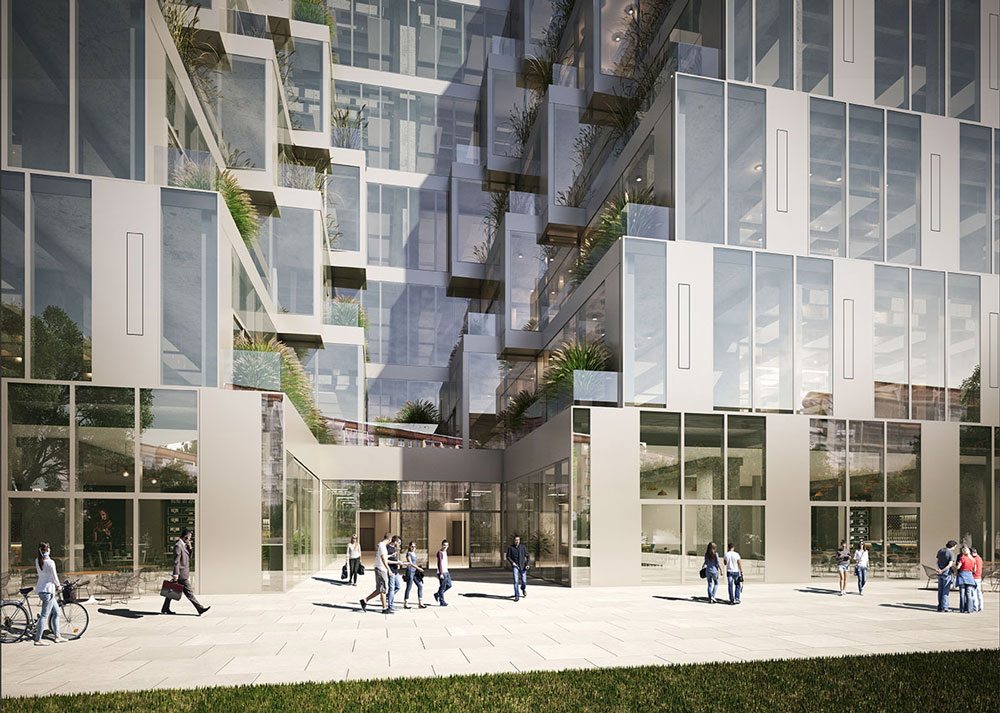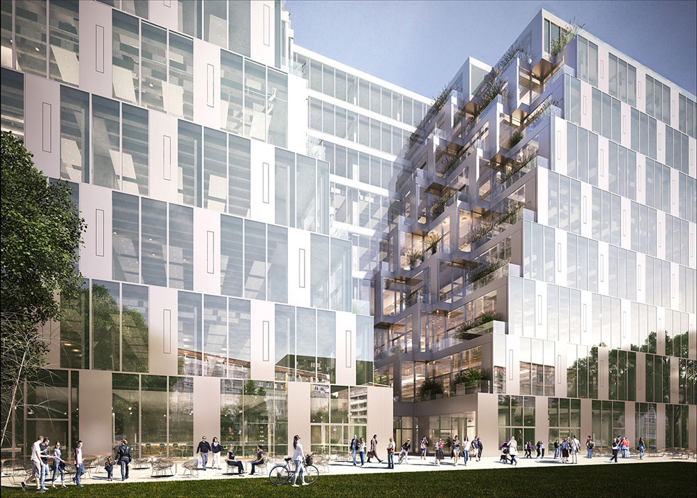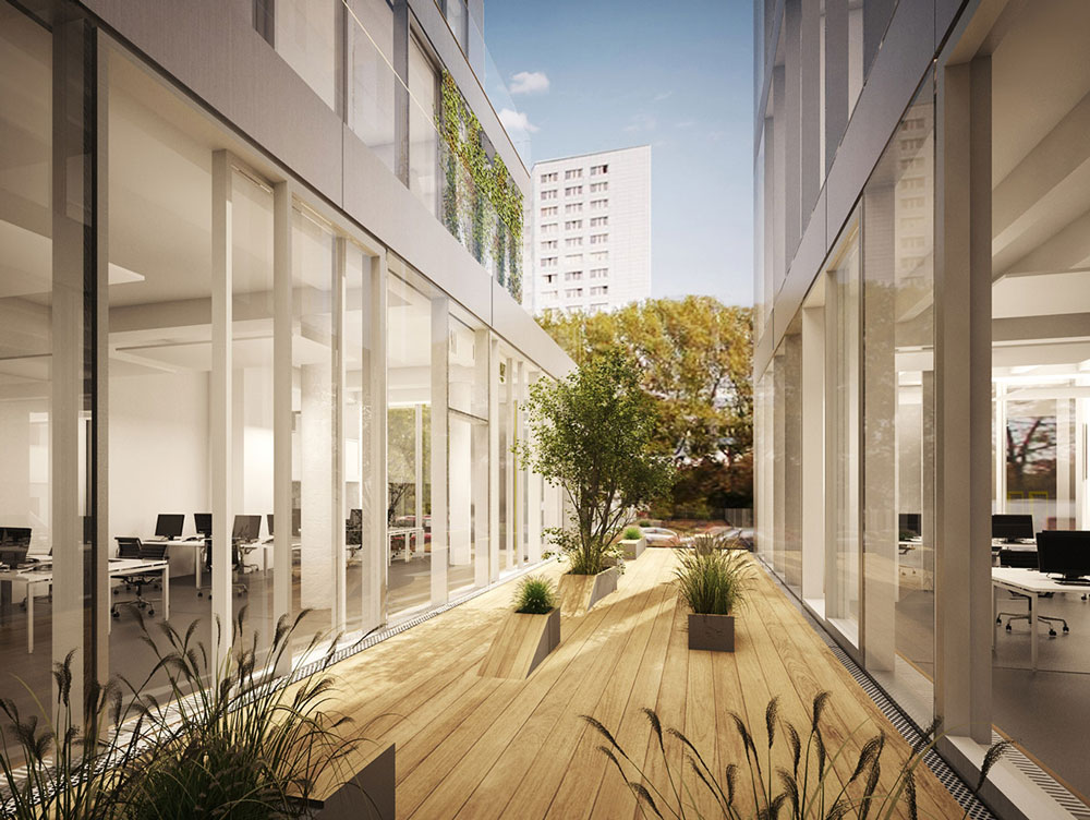 Всички етажи имат достъп до външни общи пространства за работа, забавление и релаксация. Сградата, облицована с висококачествено стъкло, която някога е била фокусиран върху интериора търговски център, е преосмислена като ориентиран към външната среда център за общуване, креативност и срещи.