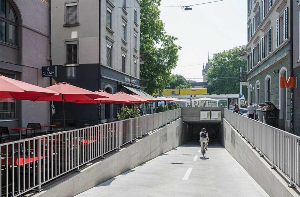 Под коловозите на централната жп гара в Цюрих преминава тунел, който дълго време не е служел за нищо. Първоначално проектиран като част от градска магистрала, той е изоставен още преди през него да премине и първият автомобил. В продължение на десетилетия съоръжението стои неизползвано под земята, но от 2025 г. в него се движат велосипеди. По проект на цюрихското архитектурно бюро Huggenbergerfries, градският тунел е реактивиран с относително малко на брой интервенции.