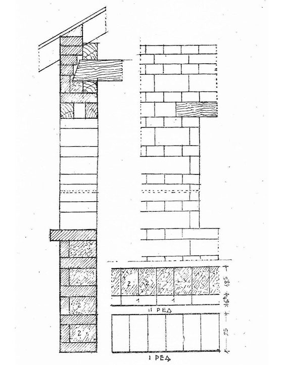 Комбинирана зидария с тухли и кирпичи с 25 см дебелина: 1-тухла, 2-кирпичи