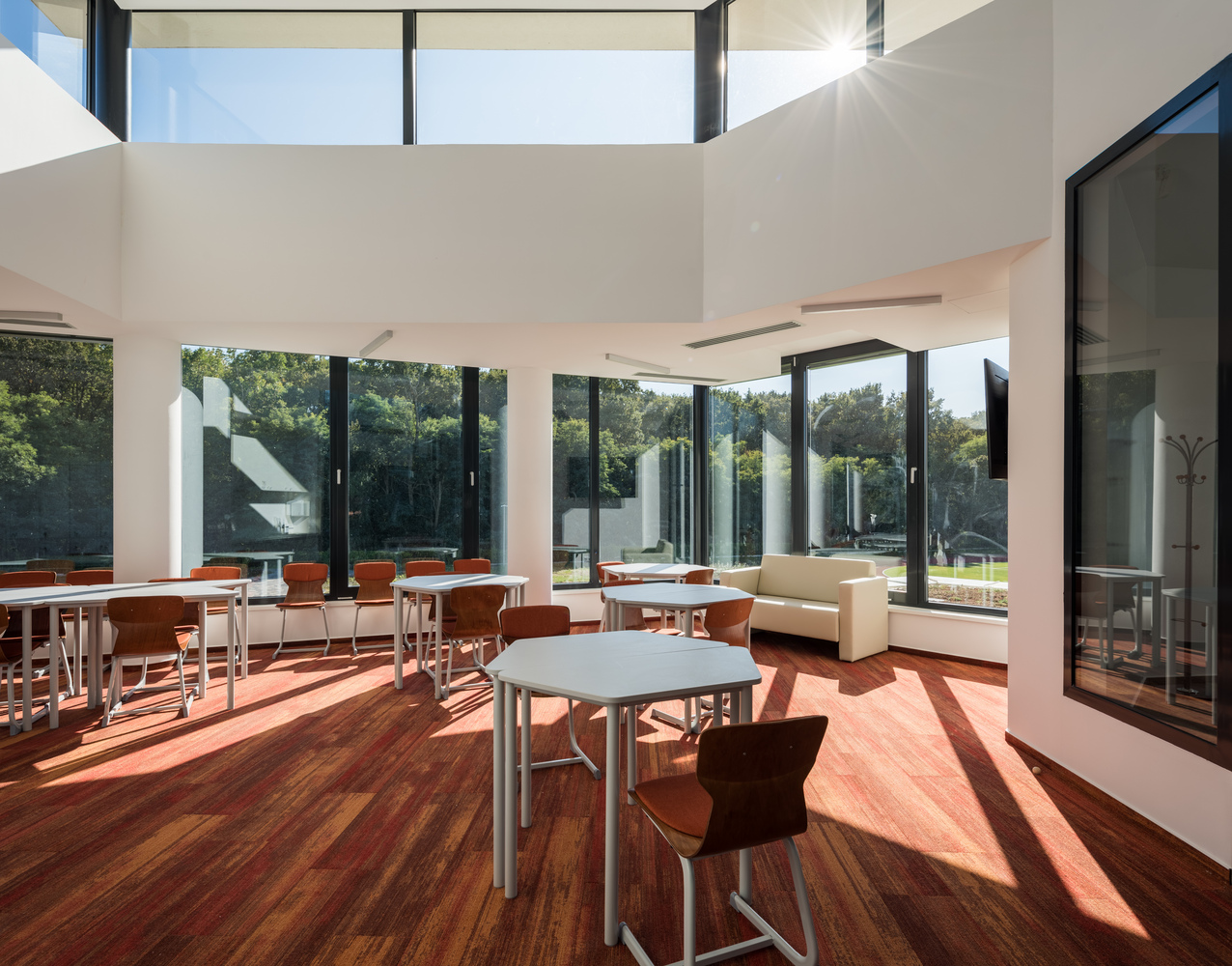 От нивото на класните стаи подобни на мостове конструкции водят до баскетболното игрище. Издигнато над земята, от баскетболното игрище има визуална връзка към футболното игрище. Наполовина под нивото на земята е разположена спортната зала. На приземния етаж учениците са посрещнати от вътрешна градина, засенчена от дървета.