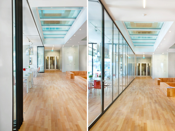 Просторната архитектура и непрекъснатото пространство на партерното ниво не само създава привлекателна и светла атмосфера, но е подходящо и за гъвкаво предназначение, например за различни мероприятия. Етажът се отваря, прегражда или разделя от ръчни плъзгащи се системи Geze MSW. Модулната им структура позволява елементите да се използват с различни функции. Това прави MSW идеално решение за прозрачни етажи.