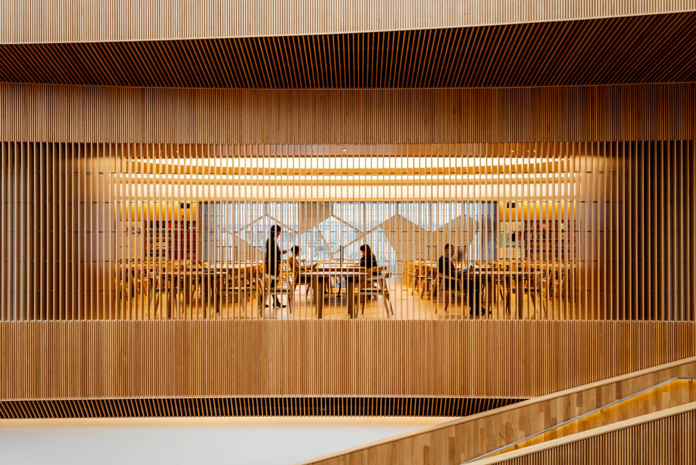 На горните нива, етажите са разделени от атриума, така че рафтовете заемат едната страна, а от другата остава свободна за площи за четене, разговори, срещи и достъп до обществени компютри. Едно от тихите помещения за четене на горния етаж е облицовано с дърво, в хармония с атриума.