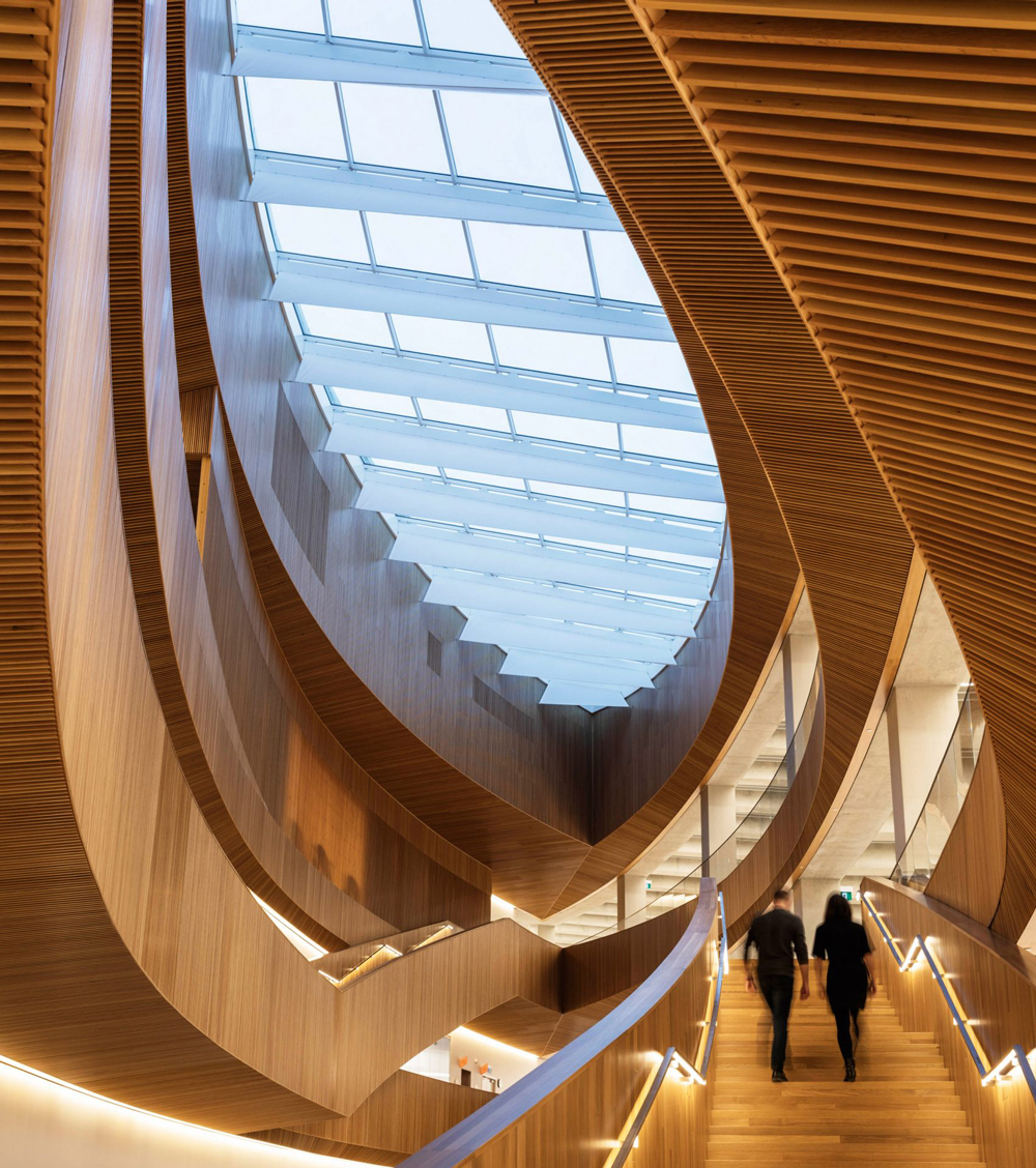 От покрития вход посетителите влизат в огромен атриум в центъра на сградата. Пространството е оформено като око или кану – препратка към първите народи на Канада – и е облицовано почти изцяло с дървени летви. Покриващ стените, стълбищата и балюстрадите на покрива, материалът осигурява топла естетика и помага за контрол на акустиката в атриума.